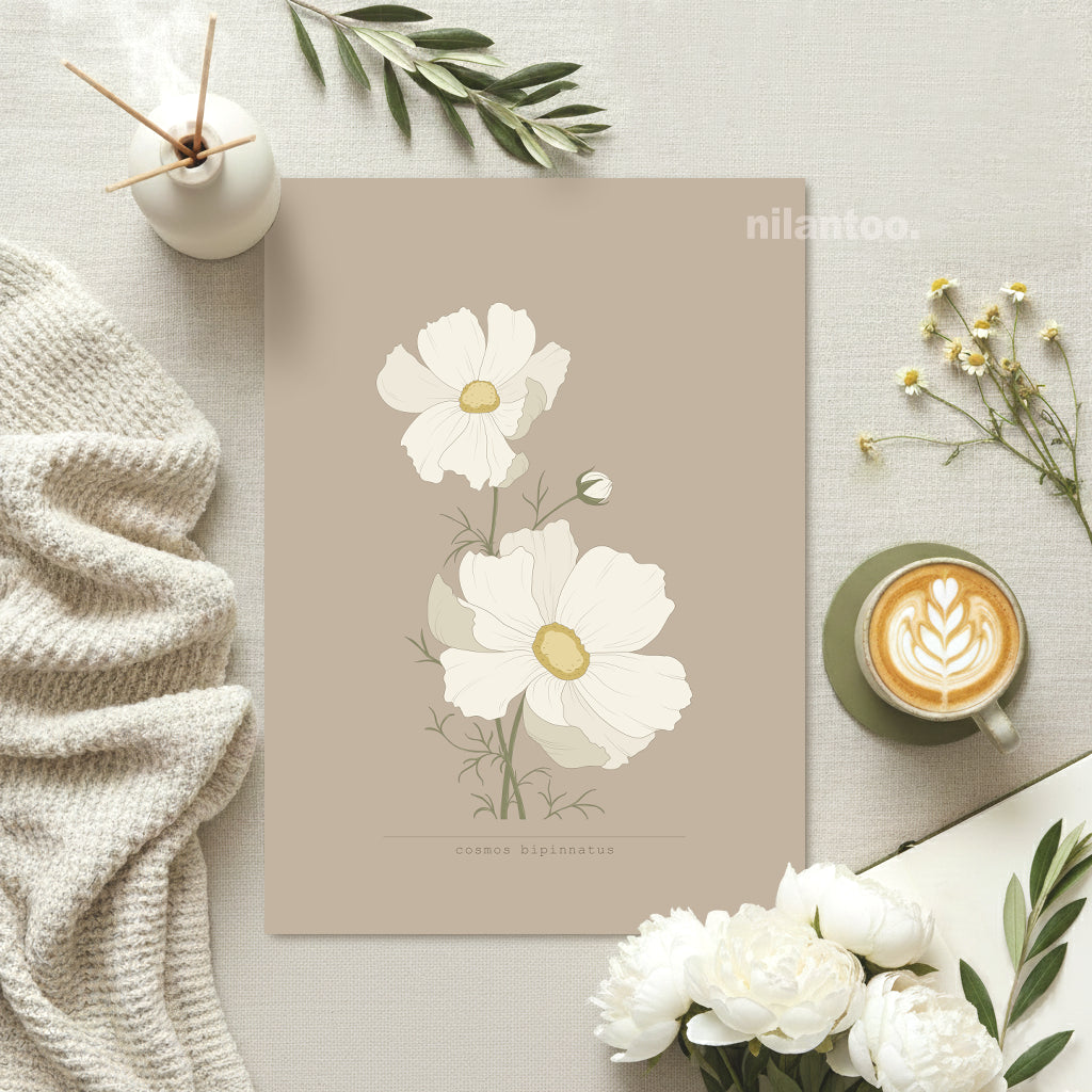 Cosmos is a delicate botanical poster inspired by the natural beauty of the Cosmos bipinnatus flower. The minimalist illustration, set in warm neutral tones of beige, cream, and soft green, brings a sense of calm, balance, and organic elegance to any interior.