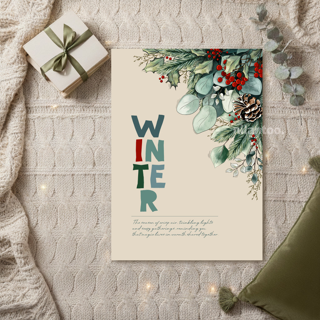 Bring a sense of calm and seasonal warmth into your interior with this elegant winter poster inspired by nature. The design features hand-drawn evergreen branches, holly leaves, red berries, and pinecones arranged in a soft, organic composition. A neutral cream background balances cool winter greens with subtle red accents, creating a timeless and cozy aesthetic.